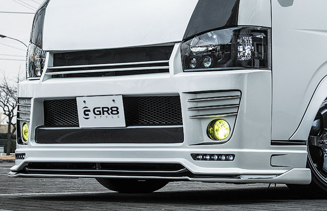 大開口のダクト処理やフィンを使ったアレンジでレーシーさを強調しているGR8のフロントバンパー。