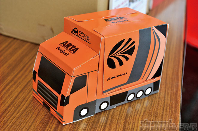 DIYの強い味方、エーモンブースで大盛況だったペーパークラフトによるDIY体験教室。トラック型のペーパークラフトは、扉を開けるとLEDが光る仕組みだ。