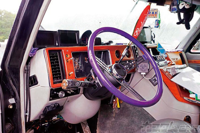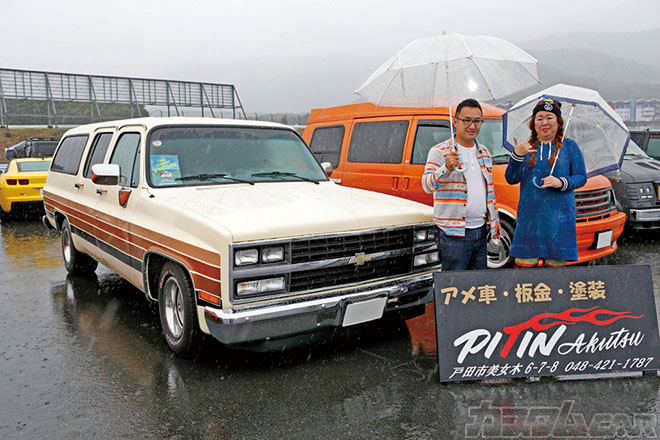 前から見ても後ろから見ても、室内を見てもイバりの効いたRyoサンのシェビーバン。思いついたことは全部やってみました的なノリを感じるバニング仕様。リアのカーゴボックスはフレーム直付けでウインチとヒッチボール付き。その中から降りてくる娘さんお二人の愛らしさとのギャップがスゴい。