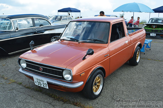 福島のスバルマニア池添サンの隠し球は、キレイな生き残りはアメリカでも数少ない初代レオーネのピックアップ版“ブラット”の逆輸入車。後ろ向きで座る荷台のシートはれっきとしたメーカー純正!!