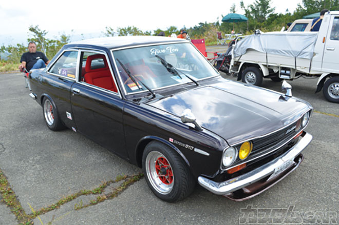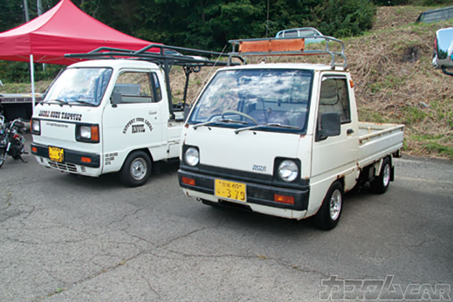 リアにデカっ羽根をセットしたRSクボ作のフルチューンA型を積む南相馬の佐藤サンの愛車。福島のゲンキを過激モディファイで表したサニトラのアッパレな競演でございます!!