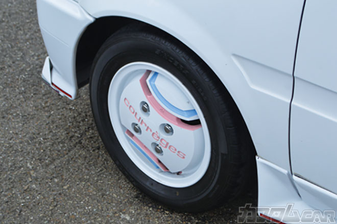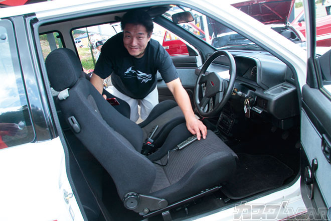 カッティングシート自作のデコレーションや車内を埋め尽くすファンシーグッズの数々も、昭和60年代の不良ヤングな風情プンプン。クレージュアルミもドン決まりな加藤サンのミラターボ。