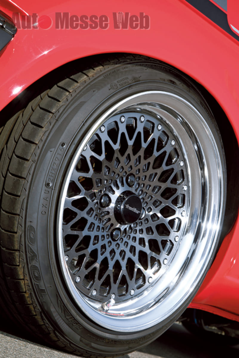 ホイールは、美しいメッシュホイールは国産鍛造3ピース『Front line FLM02』。リアはセンターディスクをインナーリム側に固定する組み方でディープ感を演出した。