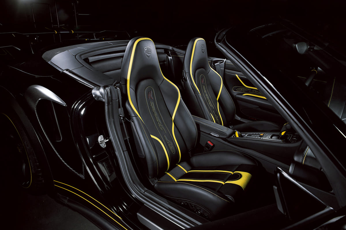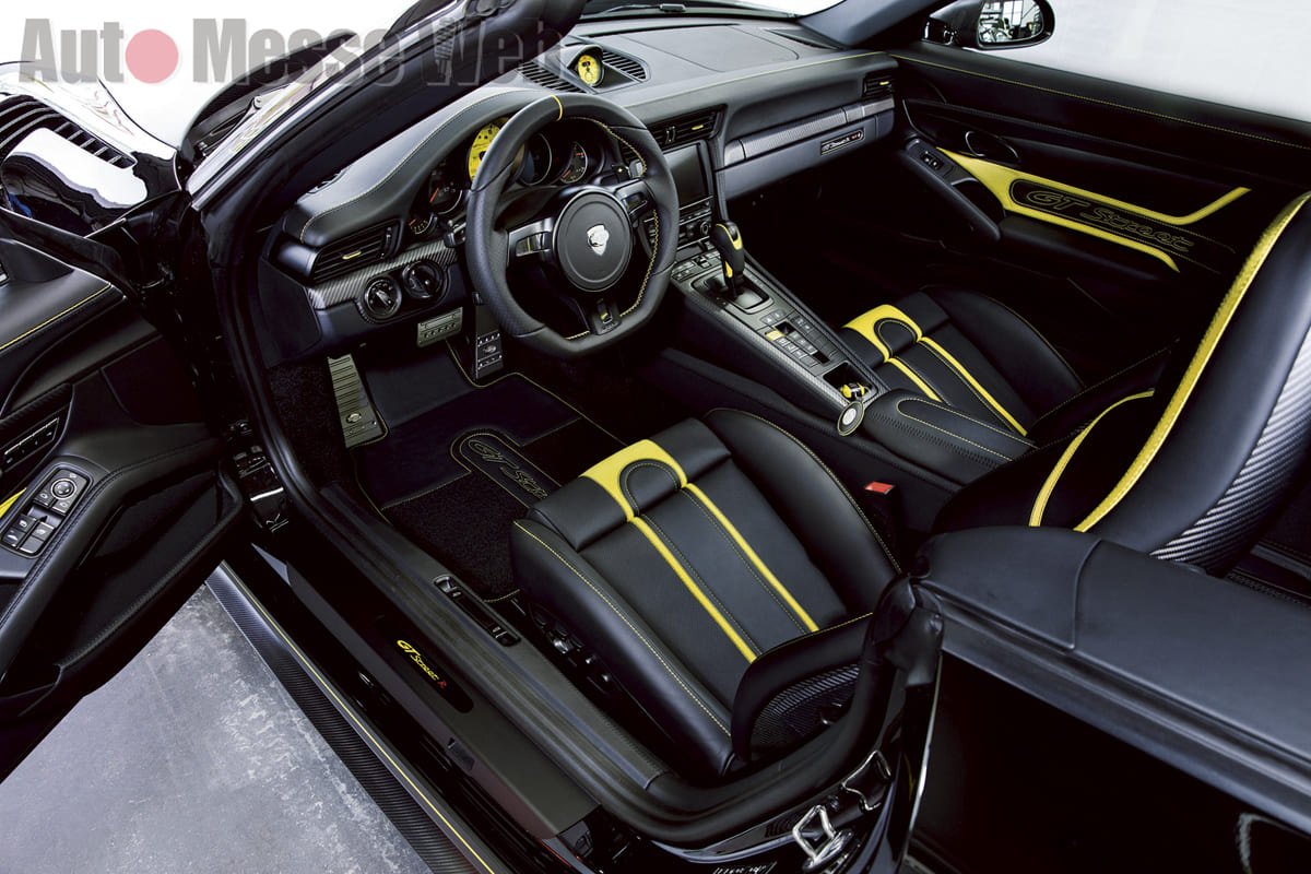 ポルシェGTストリートRは”911″をベースにしたコンプリートカーだが、カブリオレではイエローをキーカラーに大胆なラインをデザイン。スポーティであり高級感もある、「テックアート」らしい仕上がり。