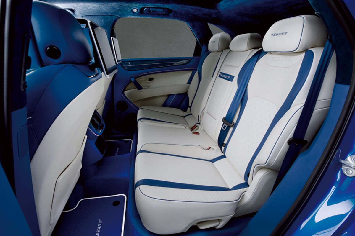 ブルーとホワイトのバイカラーとしつつ、前席と後席でパターンを入れ替えるというコーディネイトが面白い。キルティング調のステッチやブルーカーボンの色調、印象的に使われる各部の差し色など、インテリアメイクの参考になりそうな部分が盛り沢山だ。