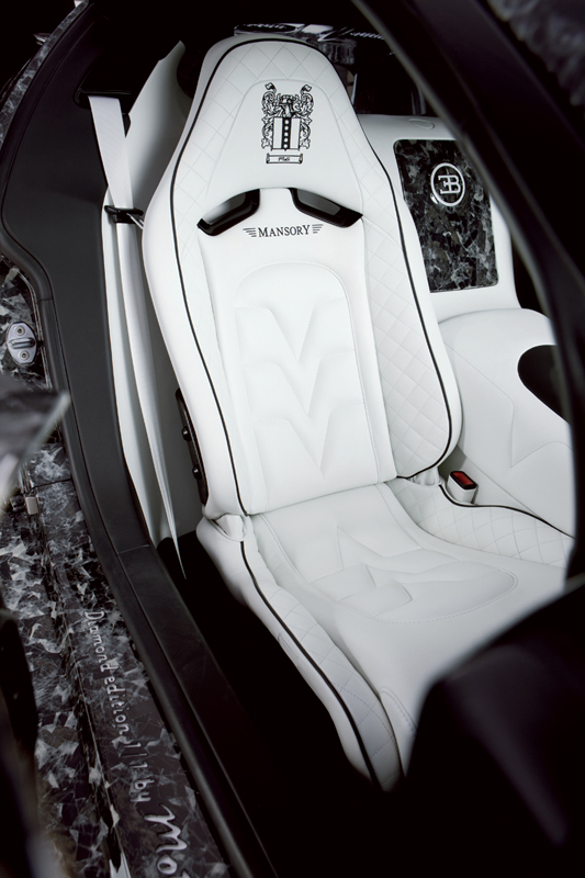 「マンソリー」が得意とするカーボン加工だが、こちらのブガッティ・ヴェイロンでは大理石調のテクスチャをもったカーボンパネルを各部に採用。文字通り、大理石のようなマーブルカラーが他にはない雰囲気を醸し出す。上質なホワイトレザーとの相性も素晴らしい。インポートカスタム