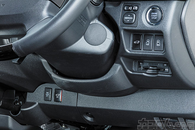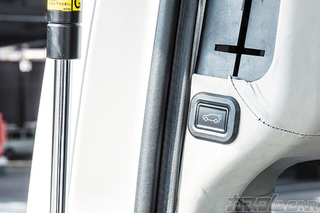 純正風にデザインされたシステムON/OFF、開閉ボタンをインパネ部のブランクスイッチスペースに配置。リアゲート側の開閉ボタンは、Dピラー横に設置されたユニットカバー下部に収められている。