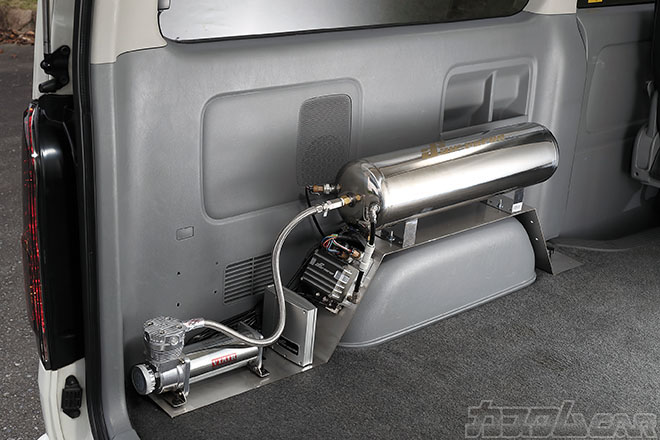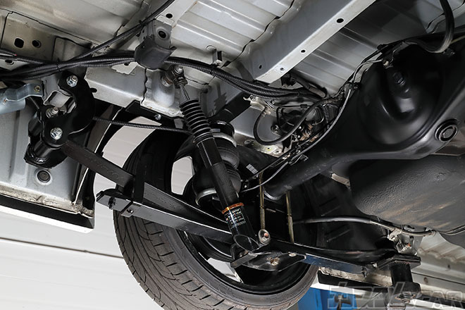 リア足は純正リーフスプリングを2枚抜いた形で流用。減衰力調整付きのオリジナル車高調とエアバッグ、ダウンブラケットとU字ボルトがキットに含まれる。必要不可欠なパーツがすべて揃っていることがキットのウリだ。