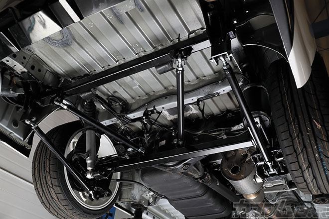 過激な低さを求める人向ききに、リーフリジッドから4リンク式サスペンションへと変更するボルトオン4リンクキットも開発中!現在試作の段階だが、こんな大掛かりな足回り変更でありながら、ボルトオンキットであることが特筆すべき点。試作品は横方向へのサブフレームがリンクのマウントとなる構造で、リンクはターンバックル機構付き&ピロ加工済み。現状、発売時期は未定だが、乞うご期待!