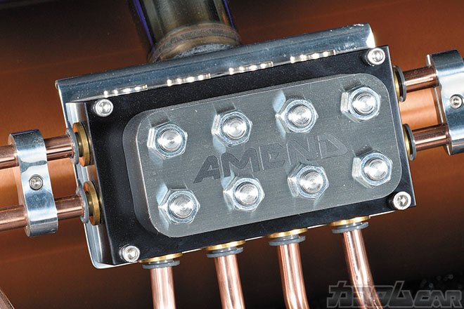 そのアメンドが人々の好奇心を強く掻き立てるポイントは、ずばりエアサスのインストールの妙。ここで紹介するデモカーは、アメンドの天野代表が信頼を置くエアサスブランド・アキュエアーをベースに、独特なアールを与えた配管レイアウトとワイヤータックによって極上フィニッシュを魅せる。