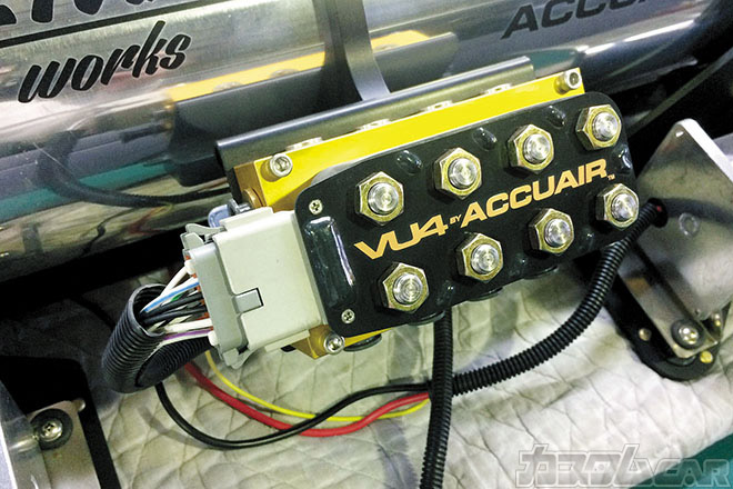 エア圧の調整を司るソレノイドバルブは、アキュエアーの「VU4」がベース。加工前と比べると一目瞭然だが、通常はサイドから突き出すはずのカプラーがない。配線を後方へ引き直し、ステンレスパイプでワンオフしたステーの中へ通すことでワイヤータックしているのだ。ソレノイドバルブの天板も作り直し、違和感のない仕上がりが技術の高さを示している。