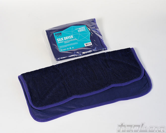 最後の仕上げは吹き上げ。洗車後の拭き取り用マイクロファイバークロスのSILKDRYERを使用。吸水効果が抜群で、塗装面にのせて引き上げるだけ。吹き上げ作業が超楽チンに!