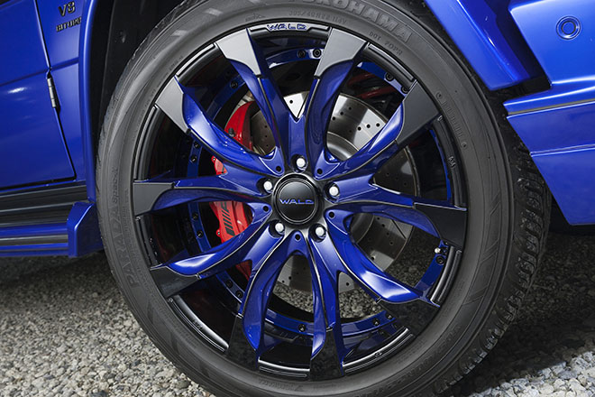 サイドでは22インチのSAVINIのアルミホイールが注目ポイント。車体の右側は5本スポークが特徴のBM11。左サイドにはスプリット5本スポークのBM14。どちらもマットカラーをチョイスし、サイドモールやサイドステップのカラーとコーディネイトさせたもの。
