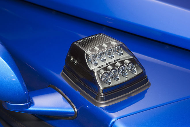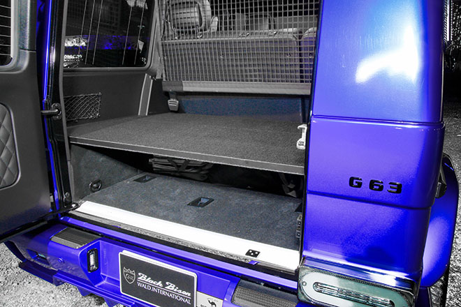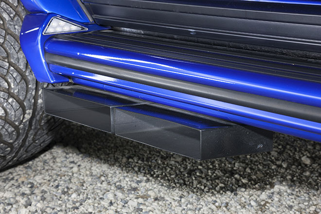 サイドモールはシルバーメッキタイプに変更し、サイドステップはLEDスポットランプ付きのものが付く。またデイライト付きのヘッドライトカバーとG63用フロントリップ(LED付き)、LEDスモークウインカーなどもカスタムポイント。フロントルーフに備わるスポイラーは個性的なアイテムだ。