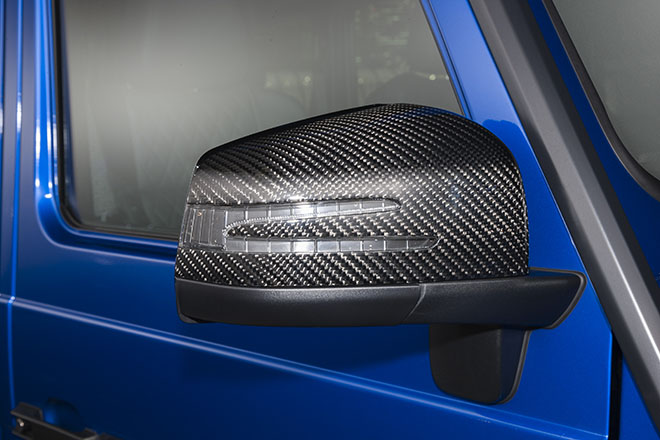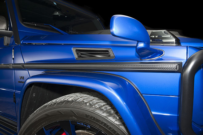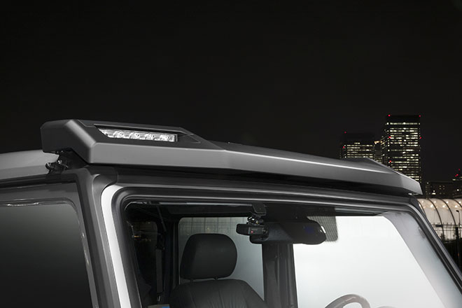 LEDデイライト付きヘッドライトカバーやG63用フロントリップ(LED付き)によってフロントマスクに新しさと迫力を与えることに成功している。さらにフロントルーフスポイラー(LED付き)を装着することで、他にはない個性も演出。