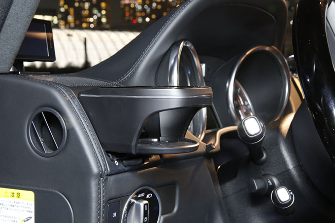 オフィス・ケイのGクラスアイテムの中でも特に人気を呼んでいるのが、リアのラゲッジテーブルと左右のエアコン吹き出し口に装着する専用設計のドリンクホルダー(01y以降モデル用)。どちらも実用性の高いアイテムだ。