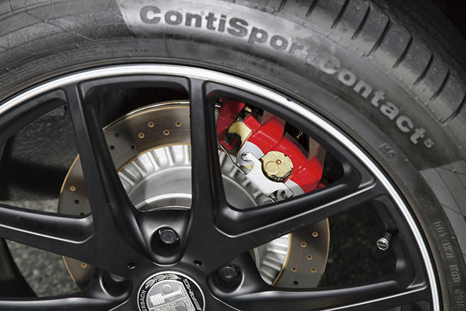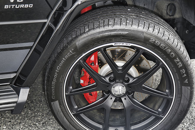 AMGのスプリット5本スポークアルミの奥には、AMGロゴが付くG63用のブレンボキャリパーと大径ローターをインストール。ただし、ノーマルのG63がホイールの前側にキャリパーが備わるのに対して、EUROはホイールの後ろ側にセットしている。またリアも大径ローターのG63用キャリパーを奢り、優れた制動力を得ることに成功している。