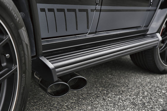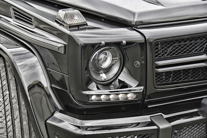 LEDのデイライト付きヘッドライトはインナーブラックのブラバスを装着。フロントバンパーとグリルはAMGのG63用を装着し、サイドステップと左右4本出しのオーバル出口マフラーはブラックアウト化。またサイドモールはカーボンモールへと変更されている。