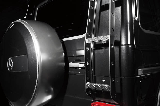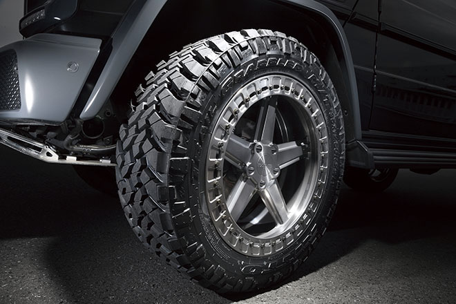 ベース車両は2017年のG350d。ノーマルと比較して、約18cmの車高アップを実現し、22インチという大径の「rotiform」ホイールやルーフラックサイドのサイドボード、スコップによって、大迫力のスタイルへとカスタマイズされたラガーコーポレーションのGクラス・オフロードバージョン。高さを強調するルーフラックは先端にディフレクターを追加。ルーフラックだけに留まらず、このディフレクターをプラスするといったこだわりが、本格的なオフロード仕様にプレミアム感を与えることに成功している。金属製のドアバイザーやホイールのリムにセットされているビードロックなども、こだわりとプレミアム性を感じさせる部分であり、本格的なオフロード仕様のみを追求したものとは異なる、全く新しい注目のスタイルとなっている。