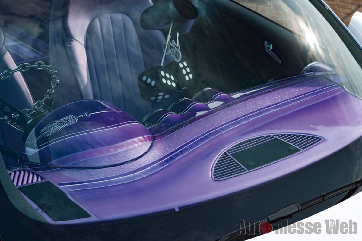 「とくにダッシュボードのカスタムペイントは気に入ってます。ダッシュボードのペイントの向きを、ルーフと直角になるように仕上げてあるんです。普通のカスタムではあまりやらないそうですけど、ペインターの人がノッてくれてこんな風に仕上がりました」。