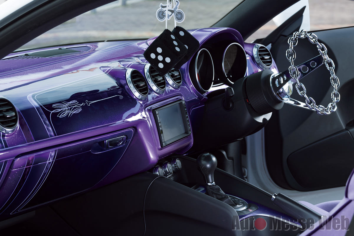 そのヨーロピアンスポーツをベースにローライダーカスタム。白いボディに紫のグラフィックスが映えるスタイリングは見事な仕上がりで、その肢体はとても新鮮だった。