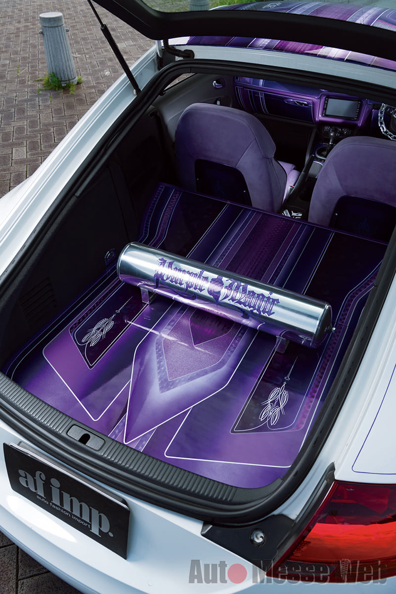 リアシートを倒しトランクスルーにして、ルーフと同じモチーフのグラフィックスを描いたボードを装着。シンプルなインテリアだが見ていて楽しい仕上がりだ。エアタンクの上にもパープルのレタリングが施されていた。