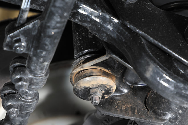 05. ダンパー下部に付くブッシュ。サビの影響を受け劣化が促進していることも。このような場合はブッシュのみの交換を実施することもある
