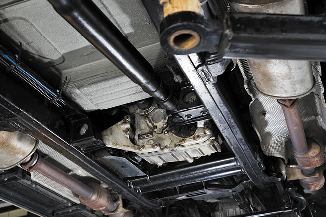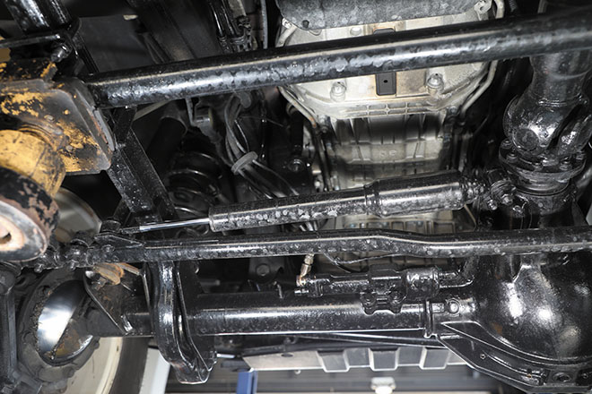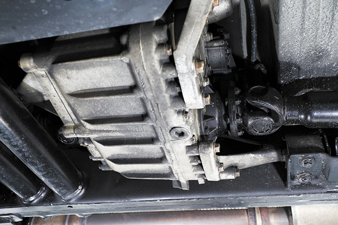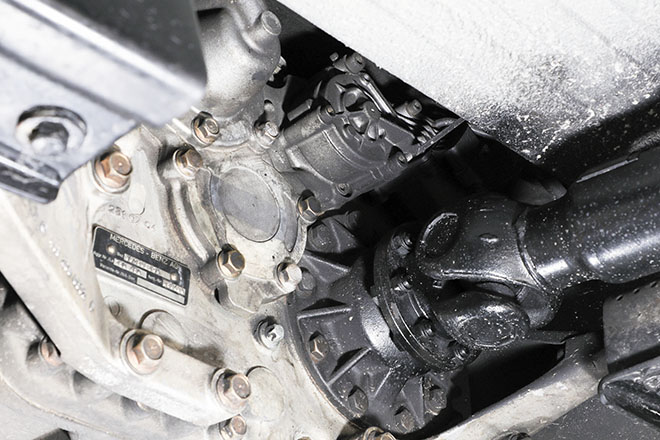 01. センターデフと副変速機の役割りを担うトランスファー。前後のプロペラシャフトが連結される部分は定期的なシール交換が必要となる。