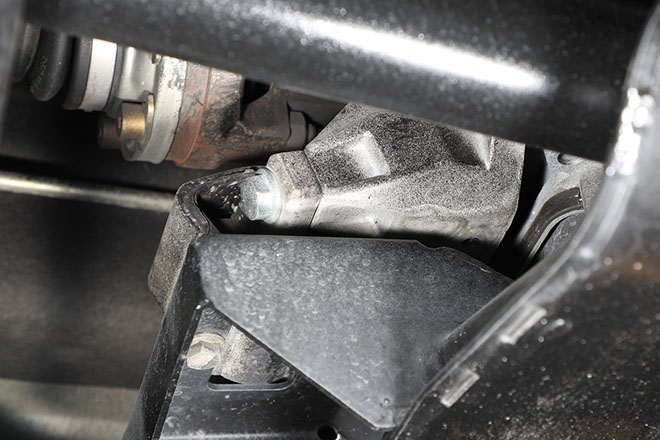 01.02. 堅牢なロアアームに収まるブッシュと横方向の動きを制御するラテラルロッドのブッシュ。このふたつのブッシュが劣化していると走行安定性に大きな影響を及ぼすため、車検ごとの点検が必須。