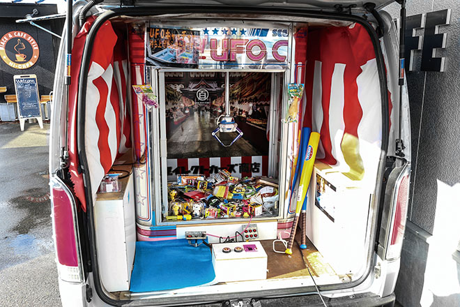 ショールーム入口に置かれていたのは、ハイエースを半分に切断し、車内に「UFOキャッチャー」を備えたディスプレイ用の車両。ハイエース好きのお父さんと子どもが一緒になって遊べるアイディアディスプレイだ。ショールーム内にも大型キッズコーナーが常設されており、家族連れも気軽に足を運べる雰囲気だ。