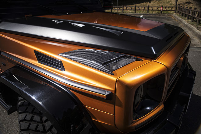 片側40㎜のワイド量を誇るオーバーフェンダーにカーボンフェンダーサイドダクト、エアロボンネット、LEDエアロウィンカーなどで野暮ったい印象を払拭し、大人の色気を演出した。リフトアップする事で目立つ腹下はIDIOM社製アンダーガードでアグレッシブかつスタイリッシュに。ロワードフォルムの先駆者としてトレンドの一歩先を突き進むGelandewagen Factoryの独創的でアグレッシブな造形美は継承しつつ、都会派オフローダーSTREET LIFT Styleとしての新境地を開拓した。