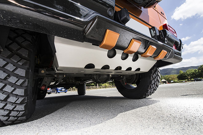 コーナーリング中のロールを抑え、適正なストローク量でハイウェイ走行を快適にこなす2インチリフトアップキットをはじめ、35インチサイズのマッドタイヤをスマートに履きこなす片側40㎜ワイドオーバーフェンダー。全高2.1m 以内に収め全幅とのバランスまで考慮されたスタイリングは特筆ものだ。