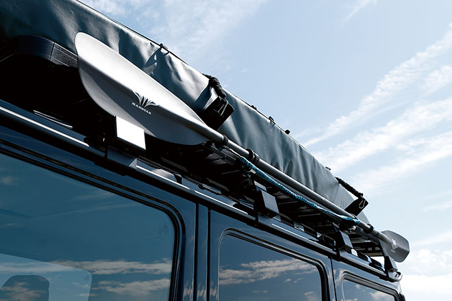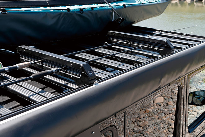 ルーフラックにはカヤックマウント、スキー&ロッドホルダーを追加。自分の使用目的に合わせた仕様に仕上げることができる。ボディサイドに備わるパネル状のラックは、ちょっとしたものを引っ掛けておくのに便利で、アイデア次第で様々な使い方が可能だ。