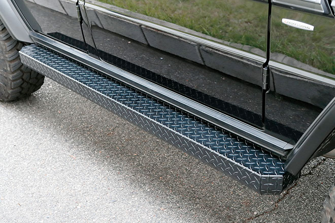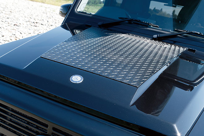 ボンネット上には、いざという時にステップにもなるアルミ製のパネルを装着。クラシックグリルと純正ライトカバーのマッチングもよく、Gクラスというよりもゲレンデヴァーゲンと呼ぶ方が、似つかわしい。運転席側にはエッジが強調されたアルティメットサイドステップを、助手席側にはやや丸みを帯びたアルミサイドステップを装着。好みや使い方に合わせてチョイス可能だ。
