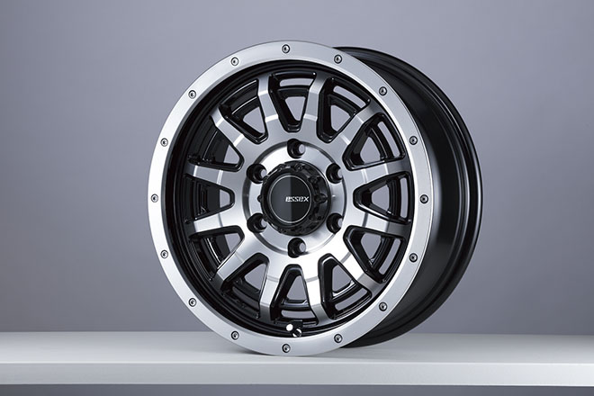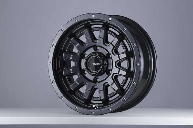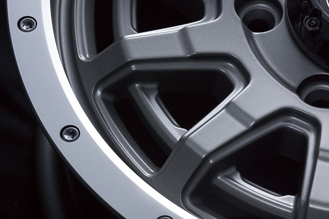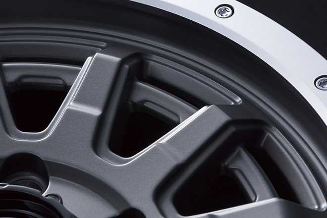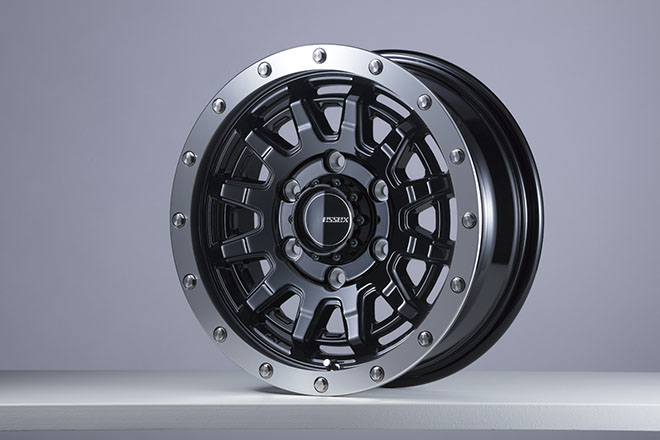 クロカン四駆好きには嬉しいデザイン要素が、多数盛り込まれた最新作EX。大きな特徴の1つであるビードロック風のリムは、サイズでアレンジが異なり、16インチはピアスボルト風に、15インチはリベット風となる。15&16インチともに、当然の車検対応品。サイズは、フェンダー内にしっかりと収まるラフな設定としている。