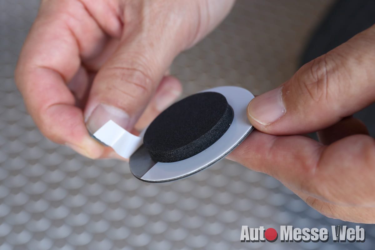 裏側は、中心に硬いスポンジが付いているので、穴の大きさに合わせれば中心がズレずに装着できる。耐候性に優れる住友3Mの両面テープを使用しているので、剥がれなどの心配は皆無だ。