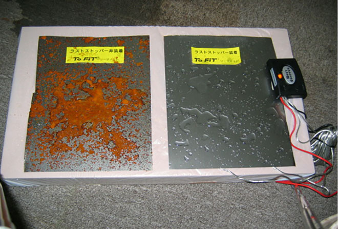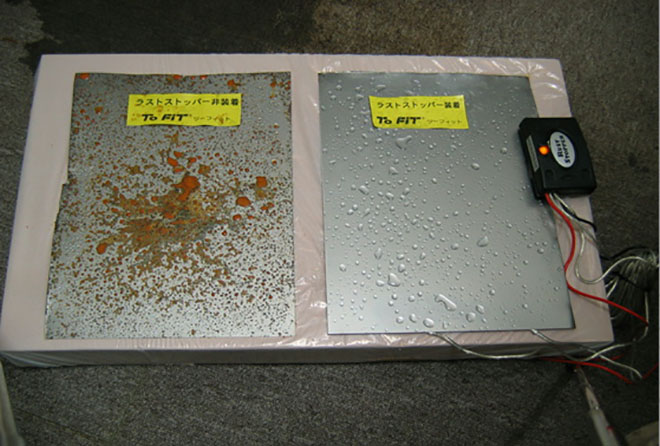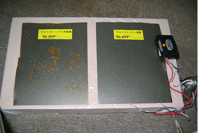 1点の写真内には、ラストストッパーを装着した鉄板(右)と何もしない状態の鉄板(左)を配置して、錆が発生しやすい環境を作った。そして、左から順に時間の経過を追って見ると、その効果は一目瞭然。48時間後(⑤の写真)には、すでに鉄板の表面に錆が進行。黄色く変色しているのが分かる。
