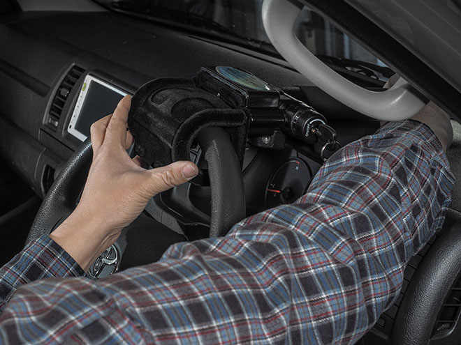 C型バックルをステアリングに掛けて、カチッと鳴るまで本体へ押し込むだけ。ビー音とLEDが点滅したらセキュリティは有効だ。