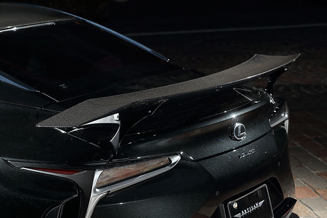 漆黒のボディカラーも効いているのか、前後フェンダーにリヤウイングが備わるにも関わらず、どことなくエレガントだ。レクサスのスタイリングにおける基本理念であるエルフィネスを心底理解し、その美しさをスポイルすることなく、流れるようなフォルムのボディパーツを植え付ける。