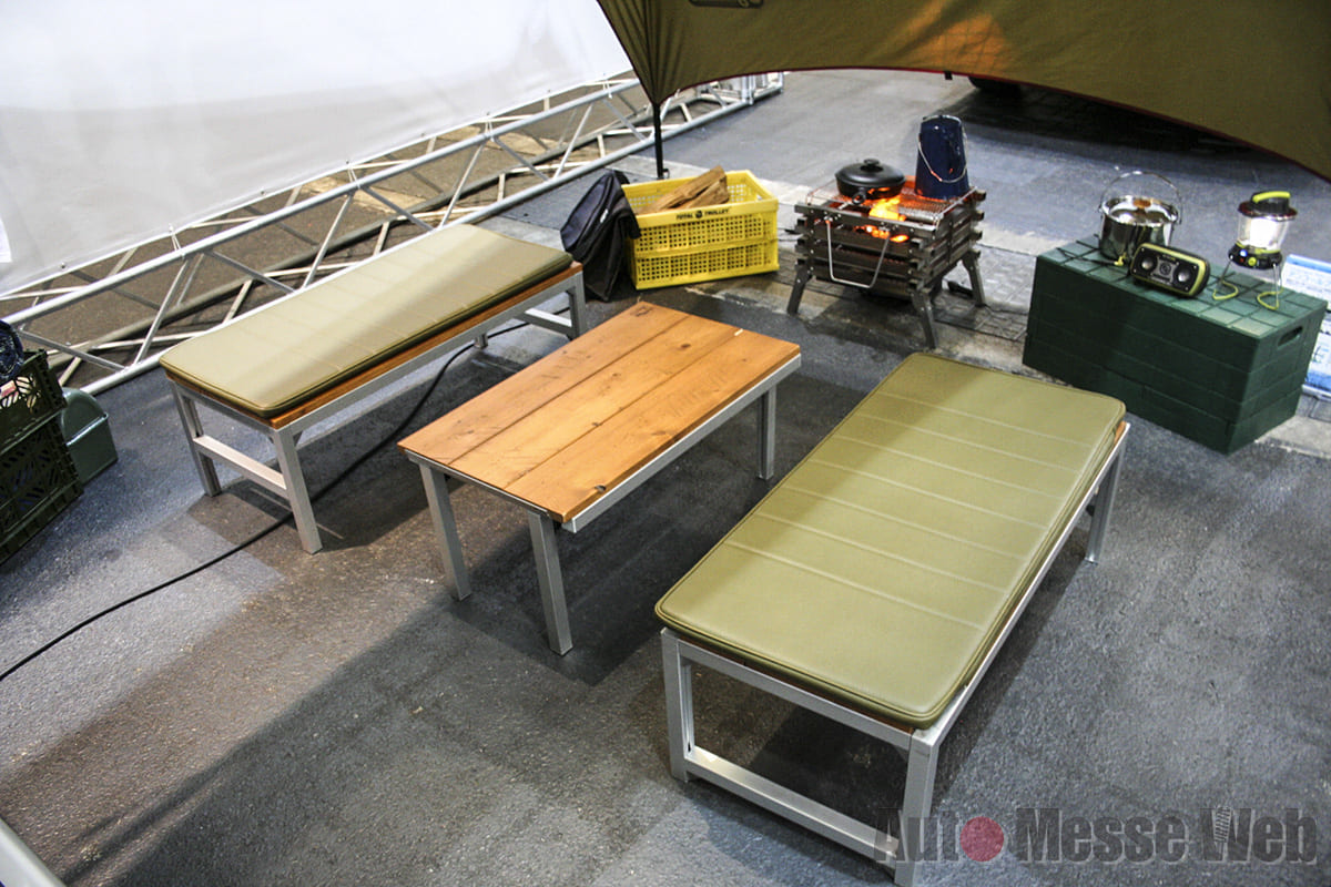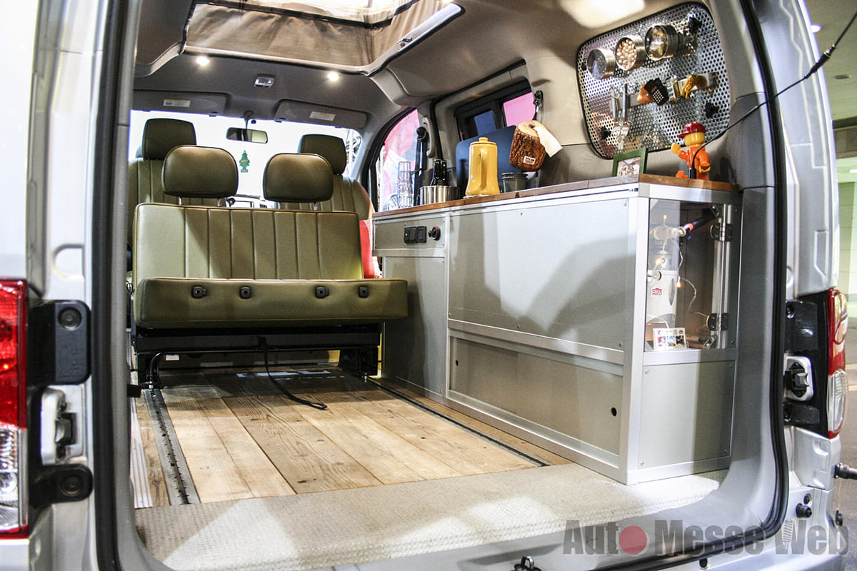 大きな特徴は、リアラゲッジルームにセットされた後部ベッド兼アウトドアベンチ。通常は荷物を載せる台として、社外に出せばベンチとして使用することができ、ベッドモードに展開する場合は、セカンドシートと合わせてベッドスペースとして使用可能。サイドカウンターにはカセットガスアダプター、ポリタンク、コンビネーションシンク&コンロ、冷蔵庫、サブバッテリーなどが装備されるなど、この1台で楽しいキャンプライフを送ることができそうだ。