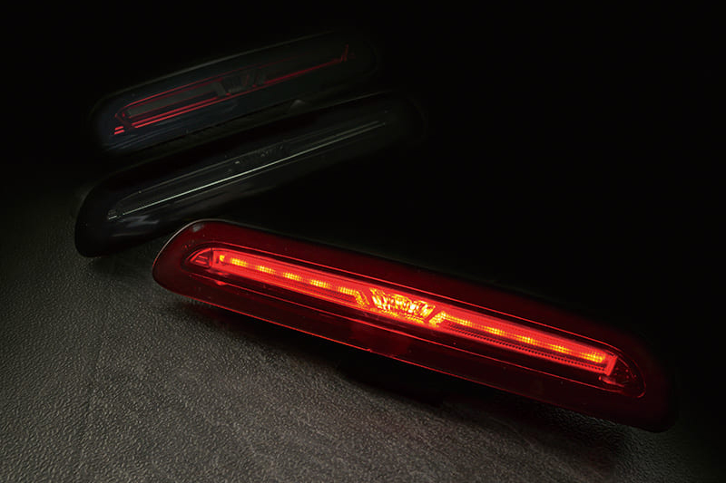 「ダズフェローズ」の新作ハイマウントストップランプは、デザインがオシャレなだけでなく、光が流れるという革新的なギミックが搭載されていることがトピックス。ウインカーはもちろんのこと、ストップランプの光が流れるのだからサプライズ度も満点で、ブレーキ連動で中央から両端へ向けて光が流れる様は、まさに未来的な雰囲気といったところ。