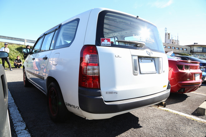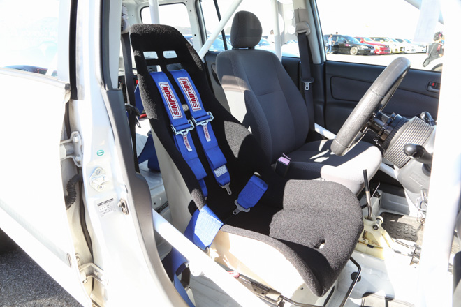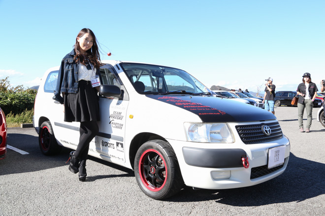 「普段コペンに乗っていて荷物が載らないので、極端に荷物が載る車をチョイス。4ナンバーのままで構造変更し、ロールゲージ、フルバケ、2名乗車で車検もクリア。珍しいマニュアルです!レースサポートカーとみせかけてそのまま走っちゃう!!」とコメント。走りのサクシードはまず見ないので取材班も釘付けの一台!