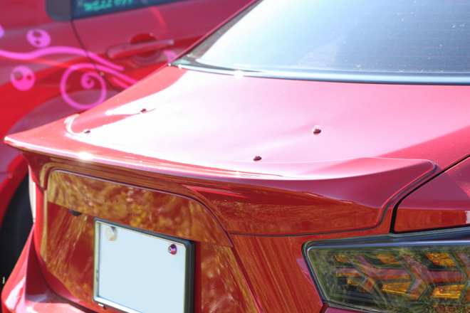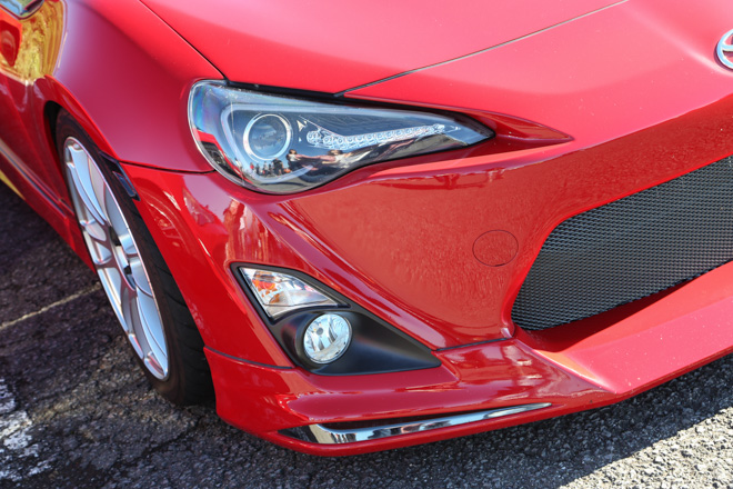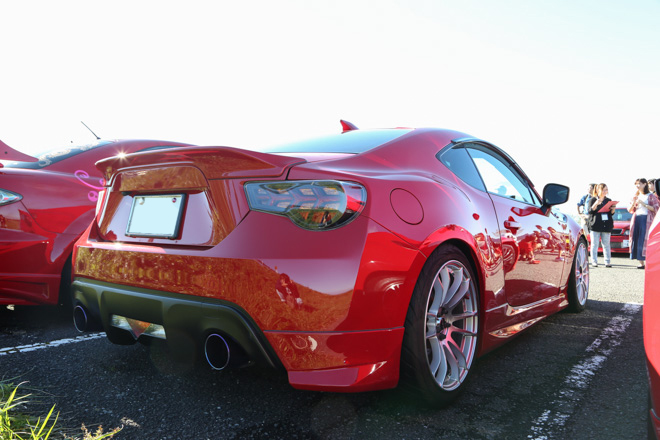 「純正バンパースムージングで他とはちょっと違う感じを出してます。」lと言葉通り、フロントにインパクトがあるめぐさんの86。前後流れるウィンカー(前クリスタルアイ・後バーディークラブ)と内装を自家塗装で赤に統一しているのもポイントだそう。レイズ18インチホイールとのツライチセッティング相性も◎。