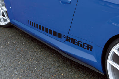 撮影車両にはリーガーチューニングのフロントスポイラーとサイドスカートも装着されていた。シンプルにスポーティさを引き出すシャープなデザインが特徴的だ。