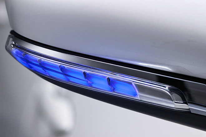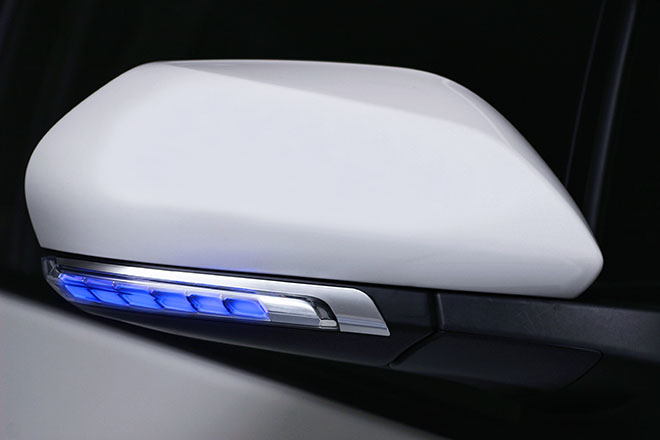 フロントからサイドに回り込む立体構造のセグメントブロックに加え、後ろ向きにLED を装着。全方位に対し視認性、ファッション性に優れた輝きを放つ。スイッチ操作でシーケンシャルアクションと通常点灯の切り替えが可能。