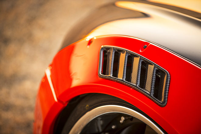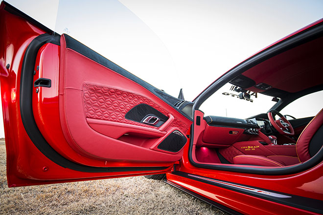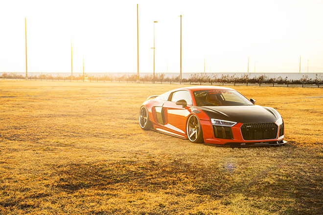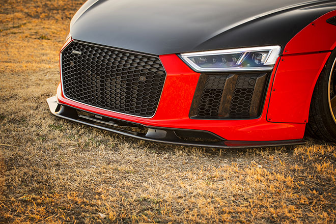 ビス留めフェンダーで大胆にワイド感を強調する迫力のたたずまいを、知的なクールなスーパースポーツであるR8に当てはめる。これが抜群に似合ってしまうのは、随所に備わるスポイラーやGTウイングで世界観を統一させたからか。まるでアウディのレーシング・デベロップメントが理路整然として開発したル・マン24時間想定のLM-GTマシンのようである。