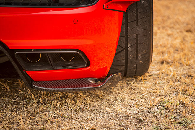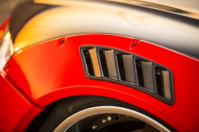 NEWINGのオリジナルブランド「Alpil」のボディパーツで統一される。目を引くのはダクトの設けられた前後オーバーフェンダーにGTウイングだが、そこにフロントリップやサイド&リアスポイラー、カーボンボンネットなどが加わり、世界観を統一する。そのスタイルに負けないサウンドを奏でるマフラーはRUI製のワンオフとなる。