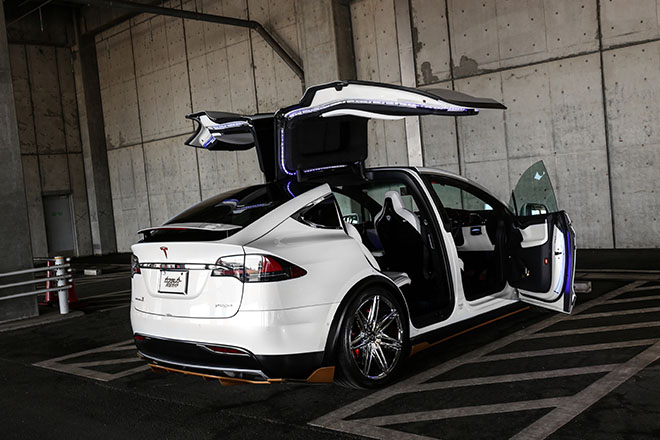 『KOKORO』は、そんなEVカーのウィークポイントを払拭した日本発のブランドだ。すでに先行発売され、高い評価を得ているモデルS(4ドアセダン)用に次ぐ今回のモデルX版でも、ボトムラインを中心とした商品構成で独自性をアピール。デモカーであるため装着された各パーツはゴールドにペイントされているが、ノーマルではモノ足りなさを感じていたテスラ特有のフラットな面に、このエアロパーツたちが躍動感を与えていることは間違い