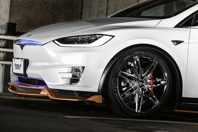 純正エアサスを任意の位置に設定することができるKOKORO オリジナルのロワリングキット(モデルS/X共通)装着に加え、ボディ4ヵ所にセットされたフェンダーアーチがモデルXの車高をより低く見せてくれている。
