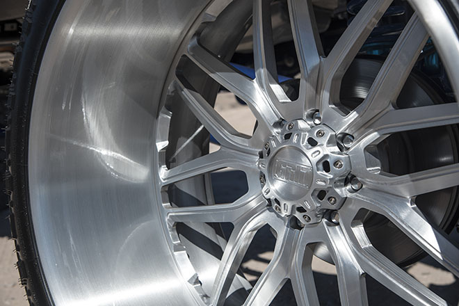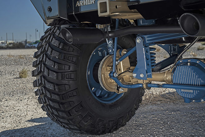 2018年型フォード・F-250にはバレットプルーフ製12インチアップキットが組み込まれている。リアは4リンク化され、前後に直径2.5インチのショックを装備。フォージド2ピース構造のGF2ホイールは8ラグ対応で、16本スポーク仕様。